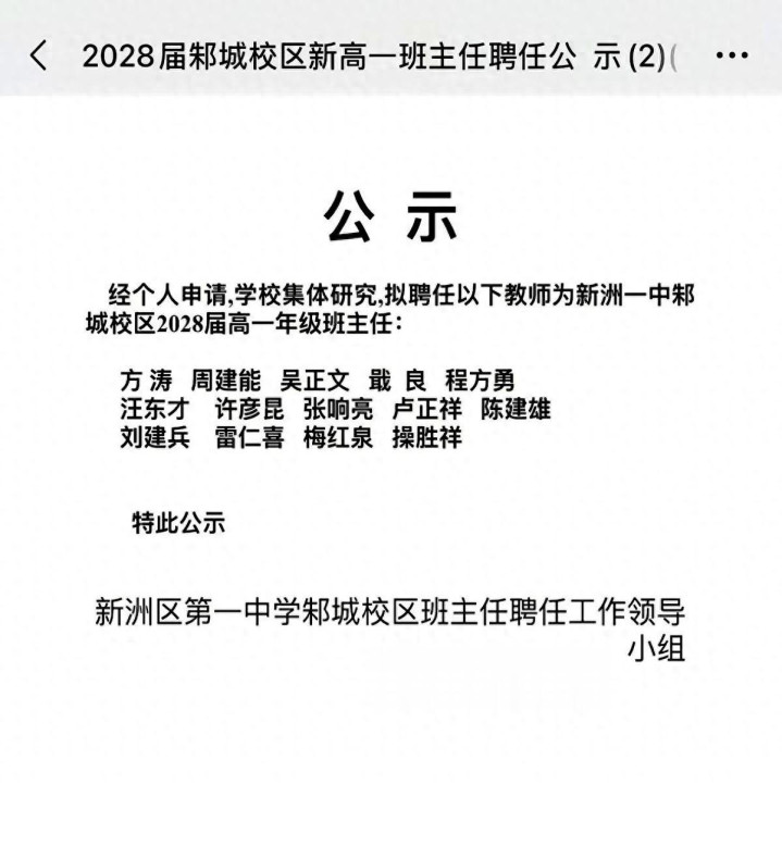 日前,湖北武汉市新洲区第一中学邾城校区的一则新高一班主任聘任公示,引发广泛热议。