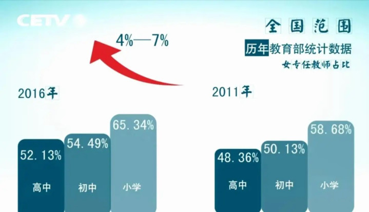 大约从2010年开始,我国中小学教师比例已经失衡,根据教育部2016年的统计数据,我国的中小学教师队伍中,女教师占比已经达到70~80%,并且学段越低,女教师的比例就越高。